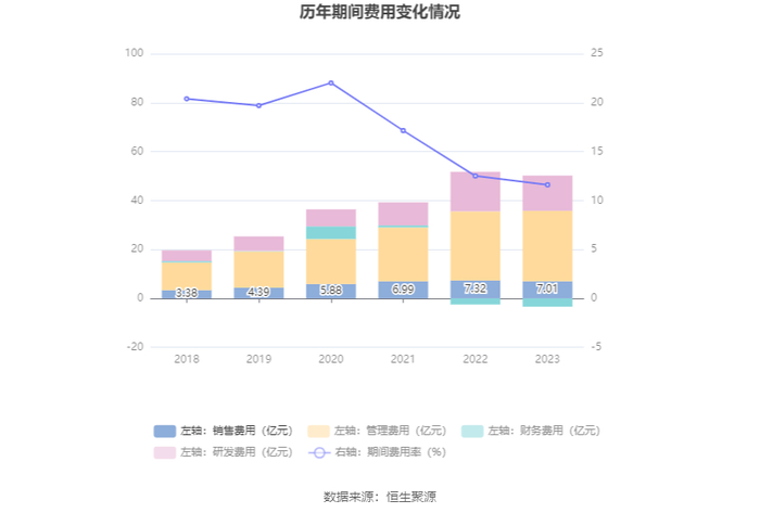 2023年,公司期间费用为46.82亿元,较上年同期减少2.41亿元;期间费用率为11.61%,较上年同期下降0.90个百分点。其中,销售费用同比下降4.18%,管理费用同比增长1.88%,研发费用同比下降10.74%,财务费用由去年同期的-2.48亿元变为-3.38亿元。