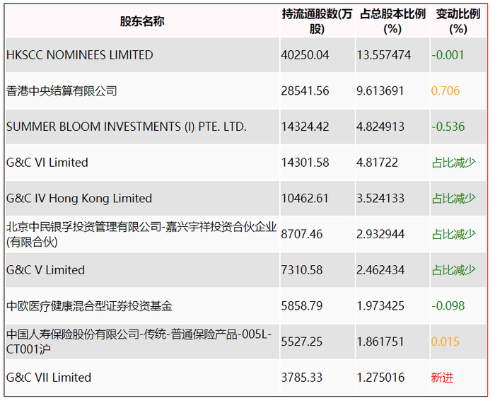 年报显示,2023年末的公司十大流通股东中,新进股东为G&C VII Limited,取代了三季度末的华宝中证医疗交易型开放式指数证券投资基金。在具体持股比例上,香港中央结算有限公司、中国人寿保险股份有限公司-传统-普通保险产品-005L-CT001沪持股有所上升,HKSCC NOMINEES LIMITED、SUMMER BLOOM INVESTMENTS (I) PTE. LTD.、G&C VI Limited、G&C IV Hong Kong Limited、北京中民银孚投资管理有限公司-嘉兴宇祥投资合伙企业(有限合伙)、G&C V Limited、中欧医疗健康混合型证券投资基金持股有所下降。
