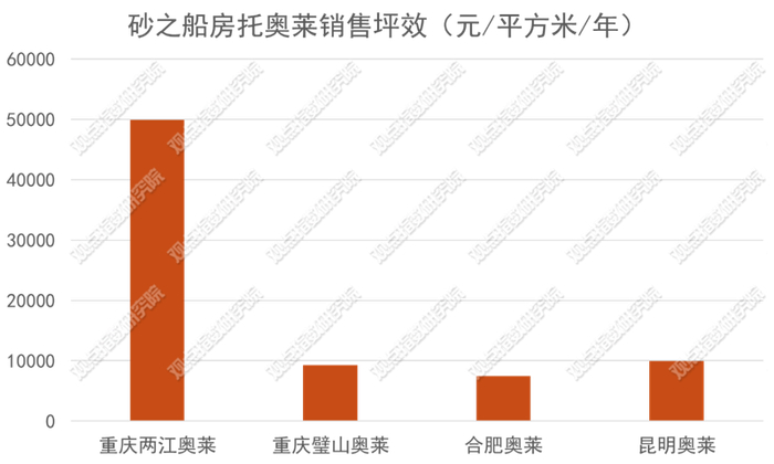 从销售坪效看,砂之船(重庆两江)奥莱也是砂之船房托持有资产中表现最好的项目。按可租赁面积计算,该项目2023年销售坪效达到4.99万/平米/年,而其他三个项目销售坪效在1万元以下。