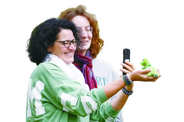 游客举着尼斯湖水怪的纪念品拍照。