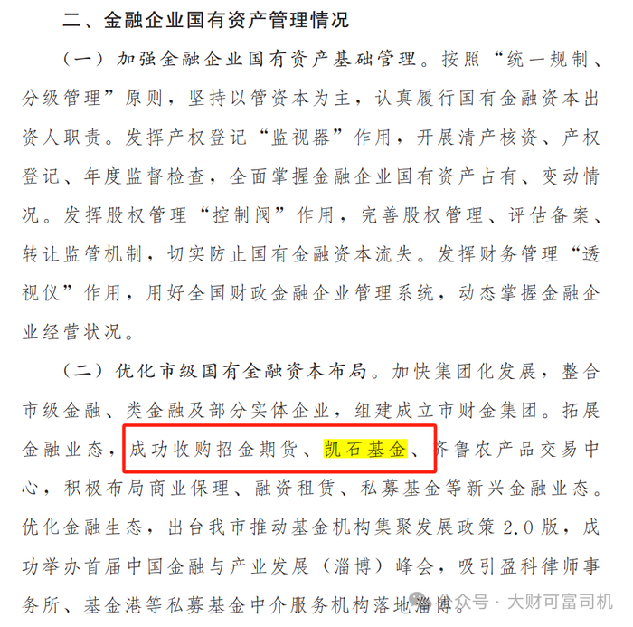根据网上一份公开资料《淄博市人民政府关于2021年度淄博市金融企业国有资产管理情况的专项报告》显示,“为加快集团化发展,整合市级金融、类金融及部分实体企业,组建成立市财金集团。拓展金融业态,成功收购招金期货、凯石基金……”