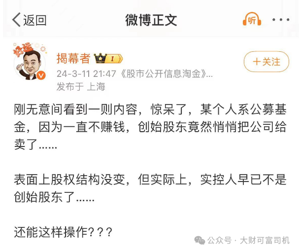 最近在财经大V在微博爆料:“刚无意间看到一则内容,惊呆了,某个人系公募基金,因为一直不赚钱,创始股东竟然悄悄把公司给卖了……表面上股权结构没变,但实际上,实控人早已不是创始股东了……”