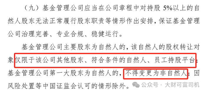 2022年7月,证监会发布《公募基金管理公司设立及变更重大事项许可》,明确“基金管理公司主要股东为自然人的,该自然人的股权转让对象仅限于该公司其他股东、符合条件的自然人、员工持股平台;基金管理公司第一大股东为自然人的,不得变更为非自然人;因风险处置等中国证监会认可的情形除外。”