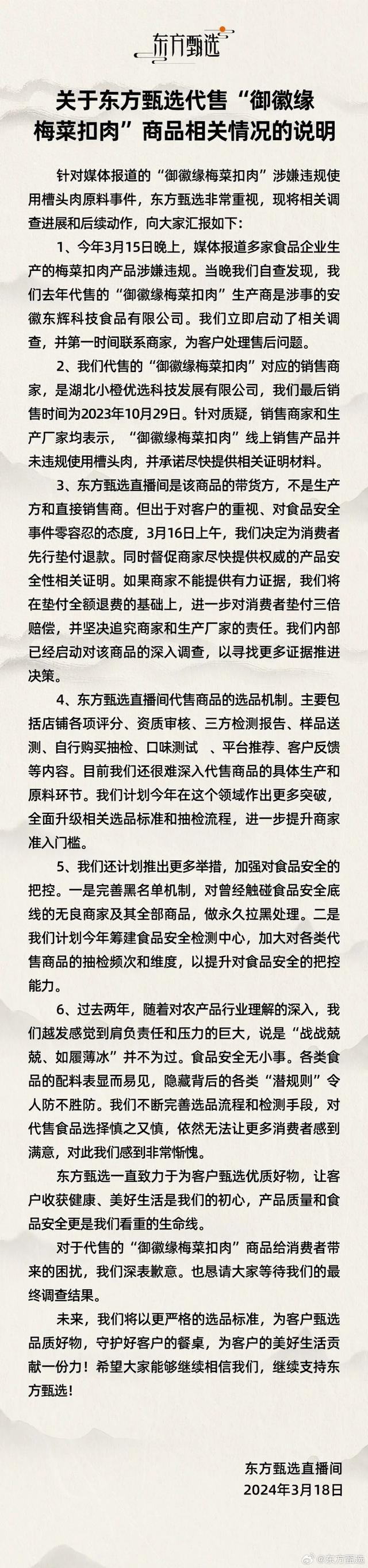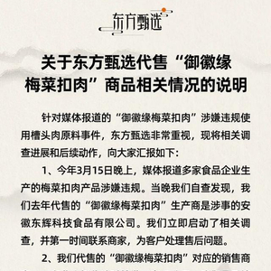 2、我们代售的“御徽缘梅菜扣肉”对应的销售商家,是湖北小橙优选科技发展有限公司,我们最后销售时间为2023年10月29日。针对质疑,销售商家和生产厂家均表示,“御徽缘梅菜扣肉”线上销售产品并未违规使用槽头肉,并承诺尽快提供相关证明材料。3、东方甄选直播间是该商品的带货方,不是生产方和直接销售商。但出于对客户的重视、对食品安全事件零容忍的态度,
