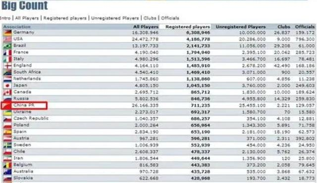 而根据国际足联此前公布的全球各国足球人口数据,中国虽然有2416万的足球人口(国际足联的标准是每周进行两次或两次以上足球活动的人数),并且注册球员达到71.1万人,但足球俱乐部只有2221个,并不比丹麦多出多少。