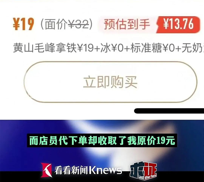 以饮品“黄山毛峰拿铁”为例,在同样的店铺,线上下单支付仅需13.76元,而店员代下单,却收取了原价19元。