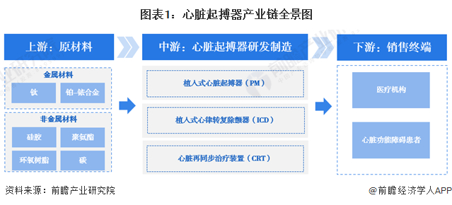 心脏起搏器产业链由上游原材料、中游心脏起搏器研发制造、下游销售渠道及应用终端三大板块构成。上游原材料主要包括金属材料及非金属材料,具体来看,主要包括封装脉冲发生器的钛金属外壳、电极导线包覆的绝缘材料硅胶、聚氨酯、环氧树脂等,以及电极材料碳、铂-铱合金等;中游主要包括植入式心脏起搏器(PM)、植入式心律转复除颤器(ICD)、心脏再同步治疗装置(CRT)的研发制造;下游主要包括各类医疗机构及心脏功能障碍患者。