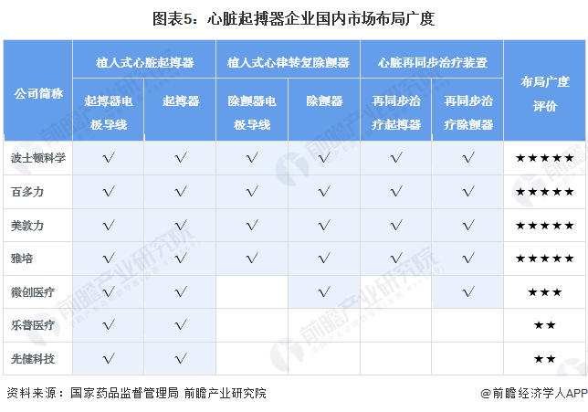 注:1)依据获得国家药品监督管理局颁布的心脏起搏器产品注册证数量划分;2)布局广度评价满分为5星;3)包含历史注册证及有效注册证