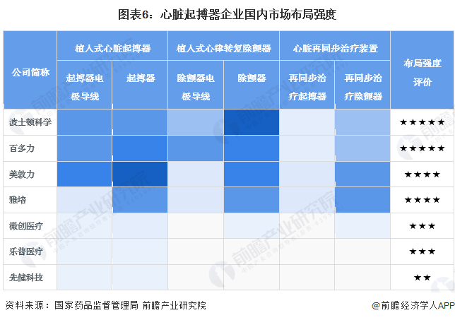 注:1)依据获得国家药品监督管理局颁布的心脏起搏器产品注册证数量划分,颜色越深,注册证数量越多;2)布局强度评价满分为5星;3)包含历史注册证及有效注册证