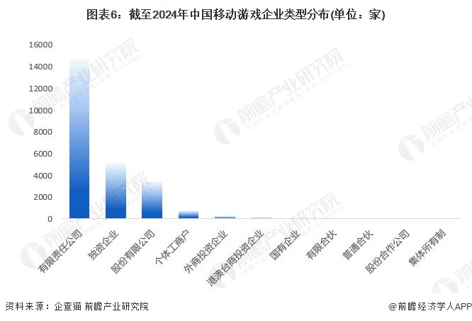 根据中国企业数据库企查猫,目前存续和在业的企业共19112家,中国移动游戏企业以有限责任公司为主,目前共有14714家,其次为独资企业,共有5150家。
