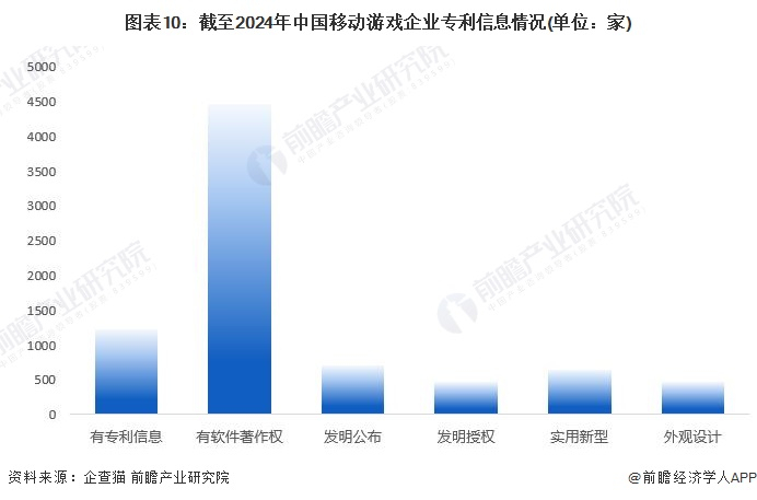 根据中国企业数据库企查猫,目前存续和在业的企业共19112家,其中1230家企业有专利信息,4462家企业有软件著作权。在专利信息中,移动游戏企业以发明为主,拥有发明信息的企业有705家,申请实用新型的企业有651家。