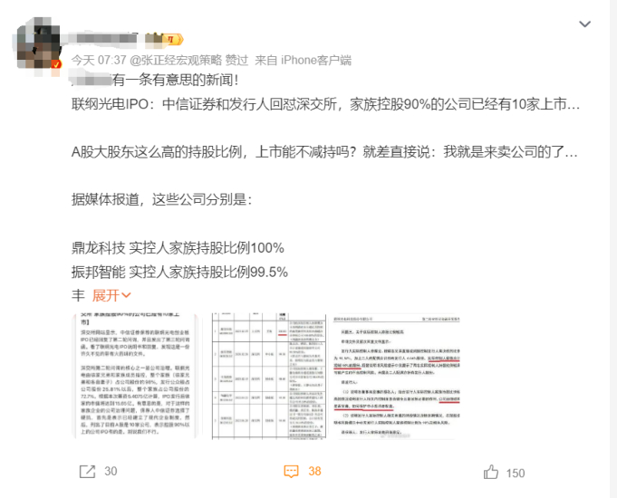 恰是上述发行人与保荐人的相关回复,被认为中信证券与联纲光电一起“硬刚”“怒怼”交易所。微博财经博主等的观点引起市场广泛关注,相关浏览量居高不下。