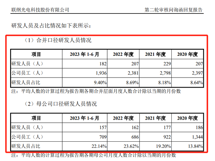 联纲光电称,公司科研人员占比及其他条件符合高新技术企业认定条件。联纲光电披露了合并口径及母公司口径研发人员占比,最新数据为2023年1-6月,合并口径研发人员占比为9.4%,母公司口径研发人员占比为22.14%。