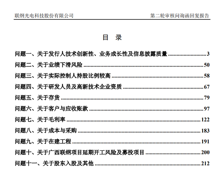 这家拟上市企业是联纲光电,深交所在第二轮问询函中提出11个问题:一是发行人技术创新性、业务成长性及信息披露质量;二是业绩下滑风险;三是实际控制人持股比例较高;四是研发人员及高新技术企业资质;五是关于存货;六是关于客户与应收账款;七是关于毛利率;八是关于成本与采购;九是关于在建工程;十是关于广西联纲项目延期开工风险及募投项目;十一是关于股东入股及其他。深交所于1月29日发出第3轮审核问询函。
