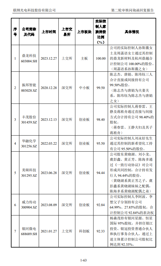 此外,联纲光电在回复中提到,近年8家实控人家族持股比例较高的上市公司情况,相关实控人家族持股比例均超过90%。