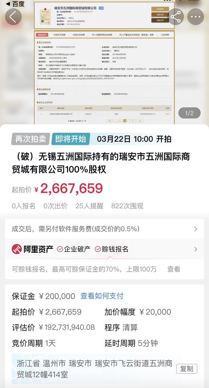 据阿里法拍公布的信息,瑞安市五洲国际商贸城有限公司成立于2013年4月,系有限责任公司(外商投资企业法人独资)。该标的物处置单位为无锡五洲国际装饰城有限公司管理人,监督单位为无锡市惠山区人民法院。