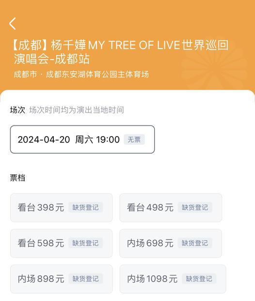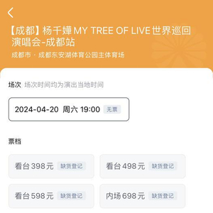 大麦网显示,4月20日杨千嬅在成都的演唱会门票门票已售罄。