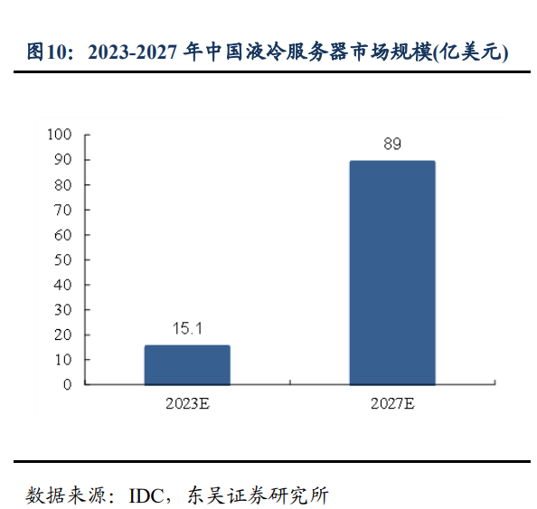 根据IDC数据,预计中国液冷服务器市场2023年全年将达到15.1亿美元,2027年达到89亿美元。