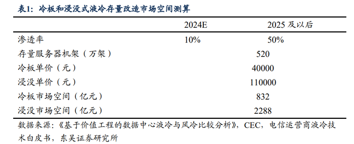 东吴证券测算,2025年及以后存量服务器改造为冷板式液冷市场空间为832亿元;假设2027年新增AI服务器全部采用冷板式液冷,市场规模为260亿元。
