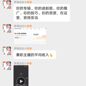 “助教老师告诉我们学完这个课程之后,喜马拉雅会提供大量的有声书给我们录,有大量的单可以接,实际上根本不可能,录书的门槛很高,需要的是足够优秀的成熟主播,我们这些小白根本接不到活儿。”阿婴向记者展示的微信截图显示,喜播教育的助教老师表示“咱们内部的主播从来不缺书录,学习三四周录书接单赚钱”,而且兼职主播“收入丰厚,持续稳定”,平均月收入达8369元。