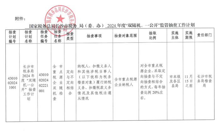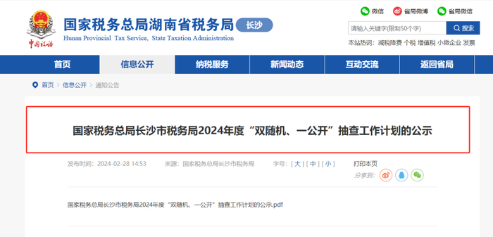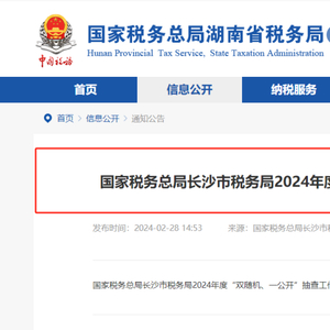 国家税务总局长沙市税务局近日发布《2024年度“双随机、一公开”抽查工作计划的公示》。