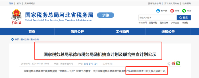 不仅是长沙,河北省承德市税局也发布了2024年度税务稽查随机抽查计划。