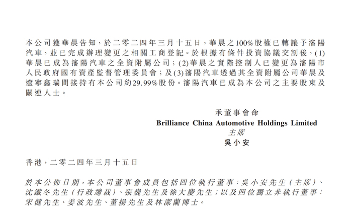 值得一提的是,3月15日,华晨中国也曾发布公告称,公司获华晨集团告知,于2024年3月15日,华晨集团的100%股权已转让予沈阳汽车,并已完成办理变更之相关工商登记。