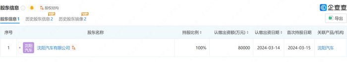 《每日经济新闻》记者查阅企查查相关信息获悉,截至目前,华晨集团注册资本为8亿元,法定代表人为沈铁冬,由沈阳汽车全资持股,沈阳汽车认缴出资额为8亿元,于2024年3月14日认缴出资,首次持股时间为2024年3月15日。