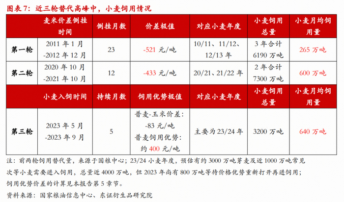 如图表5所示,在能量原料中,小麦的使用比例仍有周期性波动,但随着小麦替代经验的累积,替代比例的上限正逐渐提升。据悉,近年养殖户的换料过渡期明显缩短,从玉米日粮到小麦日粮的切换速度明显加快,我们选取最近三轮饲用替代高峰出现的时间段,进行了图表7所示的计算,在相近的替代价差之下,后期的小麦的月均饲用量高于前期,这也在一定程度上表明,小麦饲用替代技术在行业内逐渐扩散,小麦流向饲用的速度也明显加快。