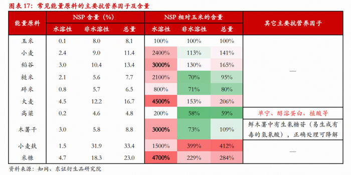 饲料原料中除了营养物质,也普遍存在着抗营养因子,是一类能减少机体对蛋白质、能量的利用的物质的统称,会降低饲养的经济效益。其作用机制通常有:1)与营养物质结合、降低其消化吸收率;2)与酶结合,抑制其活性;3)影响酶的生产和分泌等。在禾本科籽实中,常见的抗营养因子有非淀粉多糖(NSP)、植酸、单宁等,玉米中也存在NSP,只是其它种类的禾本科籽实中含量更高,尤其是抗营养作用更强的水溶性NSP,是饲用替代的常见难题。