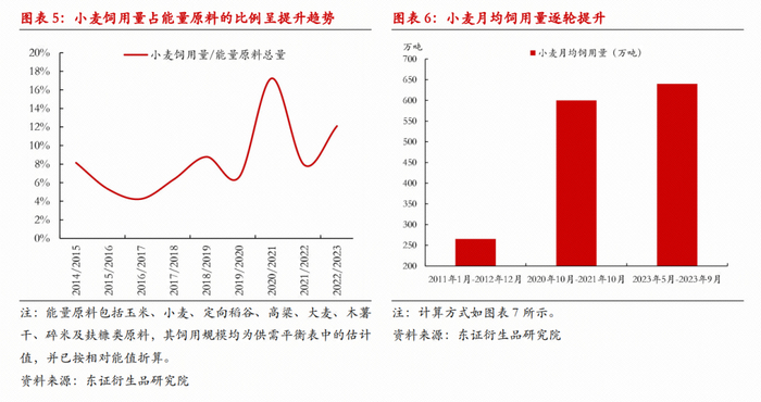 我国小麦质量分为五个等级,三等及其以上称为中等,正常情况下中等小麦产量占绝大多数,但也有少量四级、五级甚至等外小麦,其更难达到面粉企业的收购标准,且通常价格也更低,次级小麦由于产量较少,故价格数据较为缺乏,不过其价格大趋势通常与小麦均价一致。当我们观察到小麦和玉米的平均价差下跌时,低品质的小麦会逐级具备饲用替代的价格优势。因此,每年均一定量的小麦进入饲用领域,规模取决于次级小麦的产量占比和价格优势。