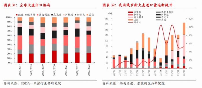 大麦的国际出口格局与高粱相比更分散,且俄罗斯亦是出口大国之一,22/23年俄罗斯的出口量在全球占比为15%,USDA预计其23/24年将提升至22%。受限于俄罗斯远东地区的交通动力和海运距离,我国往年的俄罗斯粮食进口量均几乎可忽略不计,近年在全球局势变化的助力下,进口量逐渐增加。2023年中俄签订了粮食协议,中国将在未来12年中采购俄罗斯总计7000万吨的豆类、谷物、油籽等粮食,从俄罗斯主要生产和出口的粮食种类看,预计其中麦类(大麦、小麦)的占比或将较大。