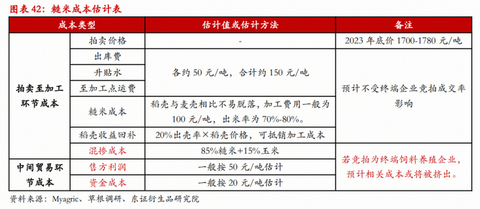 糙米的NSP含量低于小麦,抗营养作用不强,价格差合适下其理论添加上限亦较高,不过由于在黄羽肉禽料以及禽蛋料中需要额外补充色素,相比猪料中的替代,预计需要更显著的价差优势来驱动。由于去壳后的糙米成本较高,市场中流通的商业稻谷饲用的成本一般比玉米高出1000元/吨左右,难以出现饲用优势,预计未来糙米的饲用规模仍然长期是较纯粹的政策性变量。