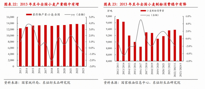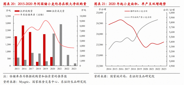 食用小麦预计将逐渐回归供需过剩的常态。在最低收购价的政策下,国产小麦在2020年之前常年存在过剩量需要国储来吸纳,临储库存也因此增加,在2020年拍卖之前,达到了库存的顶峰;随后在2020-2022年间,因弥补玉米产需缺口,库存得到了有效去化。但高价格也刺激了小麦面积的增长,单产中枢亦随时间抬升,且食用需求长期看也将随着人口的下降和饮食的多样化而减少,因此,随着玉米产需缺口减小,小麦预计将回到供需过剩的状态。当前小麦市场价虽然相比高点明显下跌,但距离最低收购价亦有一段距离,在价格跌至托市收购启动之前,若有小麦过剩,其将尝试主动流向饲用领域;即便托市收购启动,压力短期消解,随着国储库存的增加,长期看预计也将通过拍卖来释放。