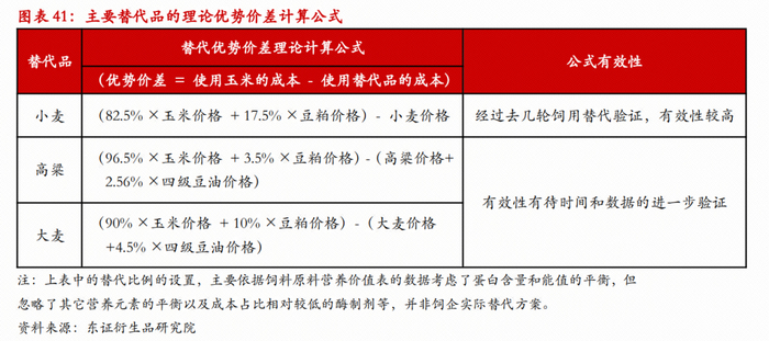 当然,小麦替代玉米还有其它的额外成本,需额外补足亚油酸、需要添加相应的酶制剂以降解抗营养因子NSP,应用在黄羽肉禽、蛋禽料中还需补充色素等。但这一类成本的波动相对豆粕价格而言较小,对替代优势的趋势变动影响相对不大。图表41展示了仅根据能量和蛋白的粗平衡推断的理论替代优势价差计算公式,经过往几轮替代验证,具备较高有效性。
