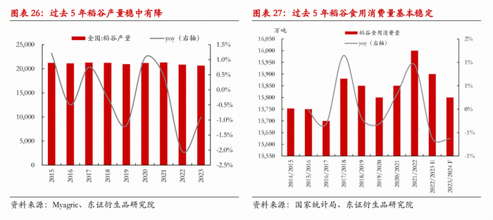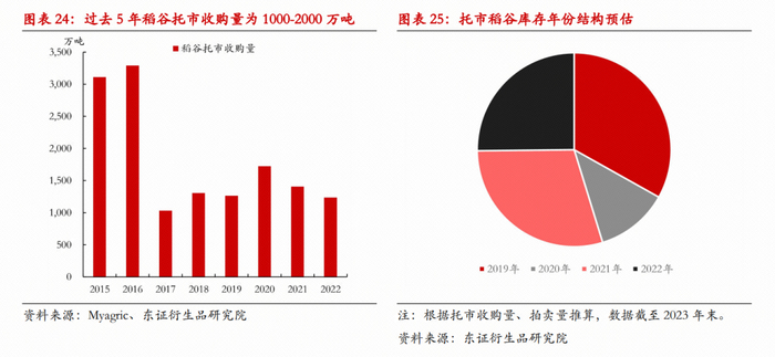 定向稻谷一般在库存5年及其以上的稻谷中选择,过去5年国内稻谷托市收购量每年均有1000多万吨,预计未来几年,每年新增的可拍卖的定向稻谷量与之相当。与小麦相似,水稻的单产亦随时间呈提升趋势,只是近年面积逐渐下调,供应量预计相对稳定;需求量长期看或也将下降,预计未来几年的托市收购量或保持相对稳定。