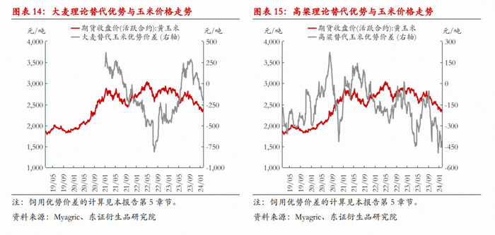比如2023年4月,中澳协商结果显示中国对澳洲大麦的“双反”禁令大概率将取消,2023年8月“双反”终止,9月起澳麦对我国出口装船开始大增,但国内玉米价格并未因此而出现波澜,直到23年10月后进口谷物同环比均增长,南方进口大麦饲用价格优势亦如期出现,市场的关注度才略有增加。历史上看,大麦替代玉米的理论价格优势,基本上被动地跟随玉米价格波动,难以反向影响玉米价格;高粱替代玉米的理论价格优势与玉米价格相关性较弱。