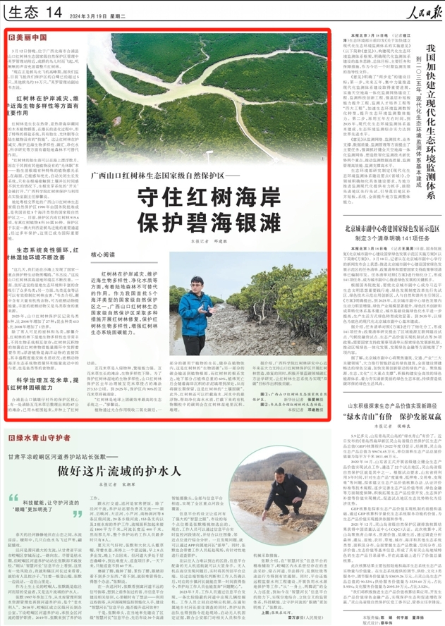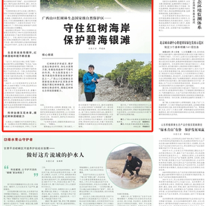 3月19日,《人民日报》第14版刊登了《广西山口红树林生态国家级自然保护区——守住红树海岸 保护碧海银滩》一文,介绍了红树林在护岸减灾、维护近海生物多样性等方面的作用,以及对广西山口红树林生态国家级自然保护区红树林开展修复的多种措施。全文如下: