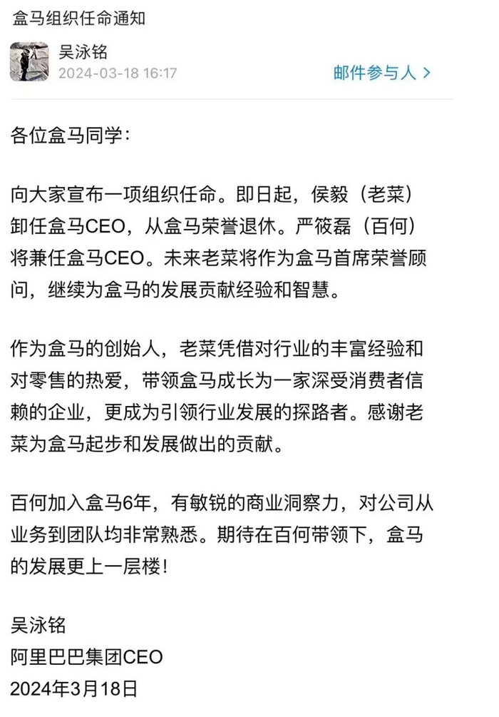 3月18日下午,阿里巴巴集团CEO吴泳铭以一封内部信,宣布盒马创始人、60岁的侯毅(花名老菜)将荣誉退休,卸任盒马CEO一职。未来,侯毅将作为首席荣誉顾问继续为盒马提供指导。盒马CFO严筱磊(花名百何)将成为新任CEO。