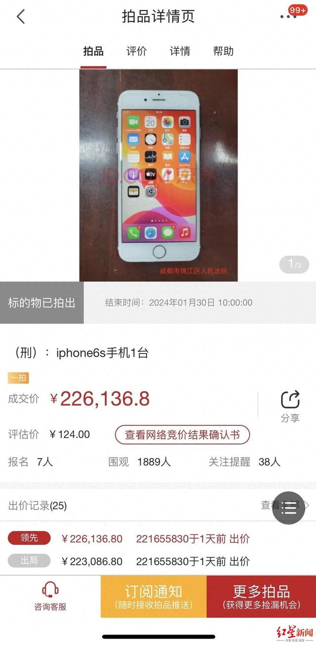 一台评估价仅124元的旧iPhone 6S手机,在4人竞价的情况下,其中1人“自己给自己加价”,最终被拍出22.6万。今年1月30日,一则法拍消息引发广大网友关注(点击查看此前报道《一台涉刑iPhone6S手机被拍出22.6万天价,法院回应》)。