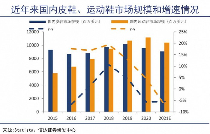 也有数据显示,我国皮鞋市场规模自2019年见顶后,逐年回落,自2015年以来,运动鞋市场规模增速都要高于皮鞋市场。到2019年,运动鞋市场规模正式反超皮鞋。