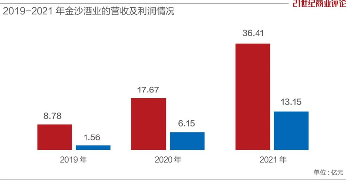 2019-2021年,金沙酒业营收从8.78亿元提高到36.41亿元,税后利润从1.56亿攀升至13.15亿元