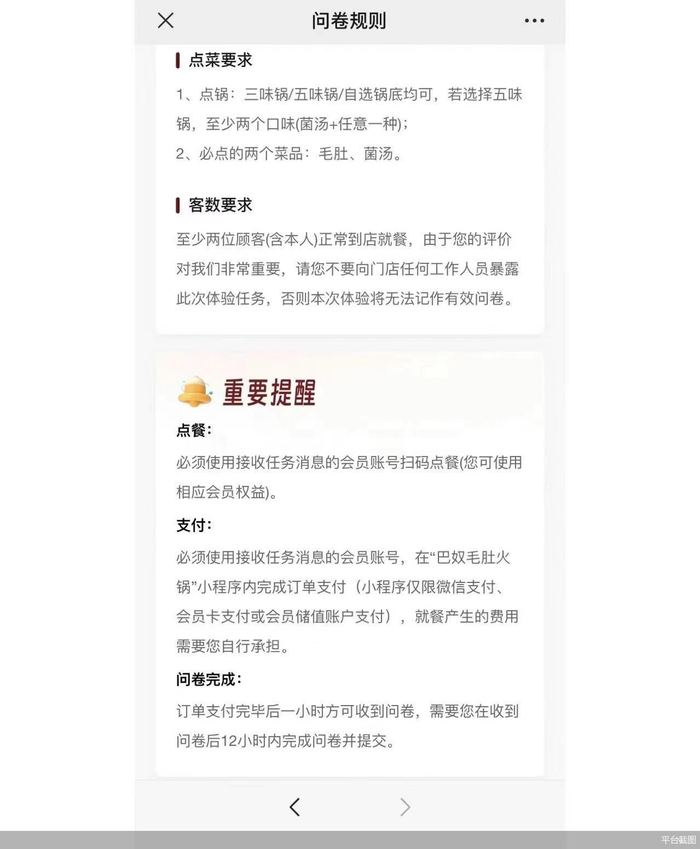 从“神秘顾客”体验活动具体内容来看,仅面向巴奴火锅的会员用户,在客数要求、菜品、时间上都有一定要求。参与“神秘顾客”体验活动至少需要两位顾客到店用餐,必须点三位锅/五味锅、自选锅底。若五味锅至少两个口味(菌汤+任意一种),菜品上必须点毛肚、菌汤两个菜品。体验需要消费者自费,还必须在规定时间内完成并完成问卷,才可赠送一张50元巴奴会员专享券,否则无法获取。