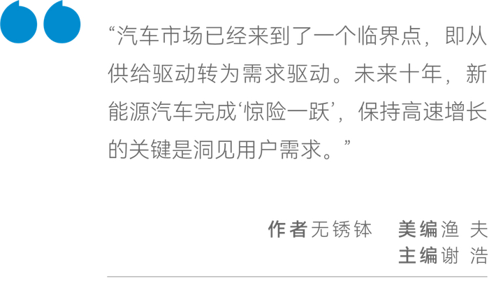 “汽车市场已经来到了一个临界点,即从供给驱动转为需求驱动。未来十年,新能源汽车完成‘惊险一跃’,保持高速增长的关键是洞见用户需求。”