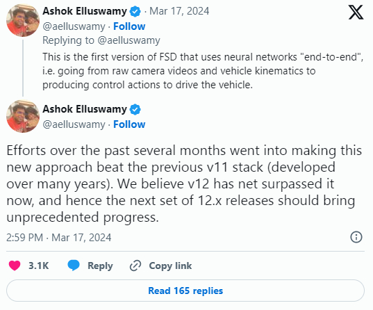 特斯拉自动驾驶软件总监Ashok Elluswamy表示,FSD Beta V12现已经超越V11堆栈,很多车主都加入了这波部署并发帖表示已经更新到最新的V12.3版本。