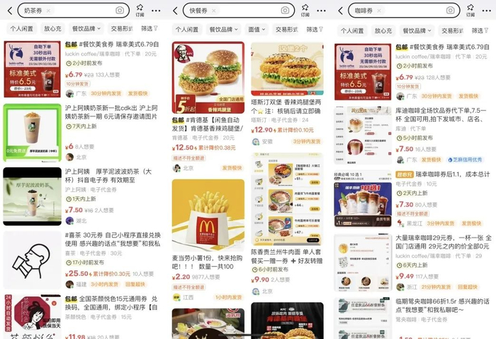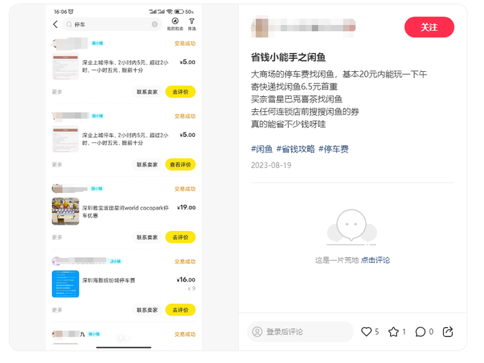 例如,大量用户分享通过闲鱼代订快餐炸鸡可以节省外卖配送费,让每天都能成为“疯狂星期四”;也有用户发掘出在闲鱼上搜索所在商场名以及停车两个关键词,就能购买堪称骨折价的停车券。