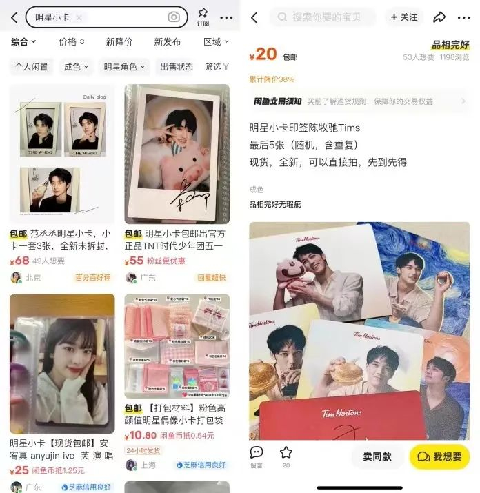 一个典型的现象是,闲鱼平台上活跃着大量明星小卡或往年专辑买卖用户。在以往,专辑一旦过了售卖期,粉丝就很难再次回购,但闲鱼让粉丝群体们能自由的购买过往专辑、交朋友、分享追星感想。