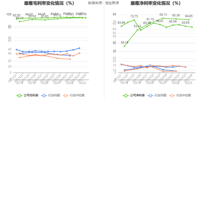 2023年,公司毛利率为95.09%,同比上升0.24个百分点;净利率为64.65%,较上年同期下降0.73个百分点。从单季度指标来看,2023年第四季度公司毛利率为94.45%,同比下降1.18个百分点,环比下降0.62个百分点;净利率为62.83%,较上年同期上升0.29个百分点,较上一季度下降1.12个百分点。