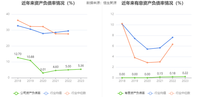 在偿债能力方面,公司2023年年末资产负债率为5.36%,相比上年末上升0.36个百分点;有息资产负债率为0.22%,相比上年末上升0.04个百分点。