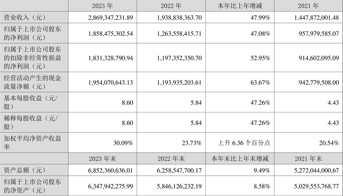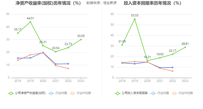 数据显示,2023年公司加权平均净资产收益率为30.09%,较上年同期增长6.36个百分点;公司2023年投入资本回报率为28.81%,较上年同期增长6.64个百分点。